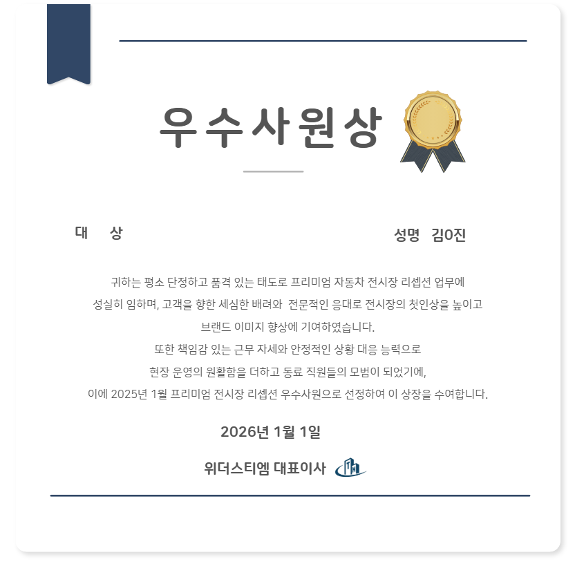 프리미엄 자동차 판매점에서 가장 먼저 고객을 맞이하는 자리, 바로 리셉션입니다.